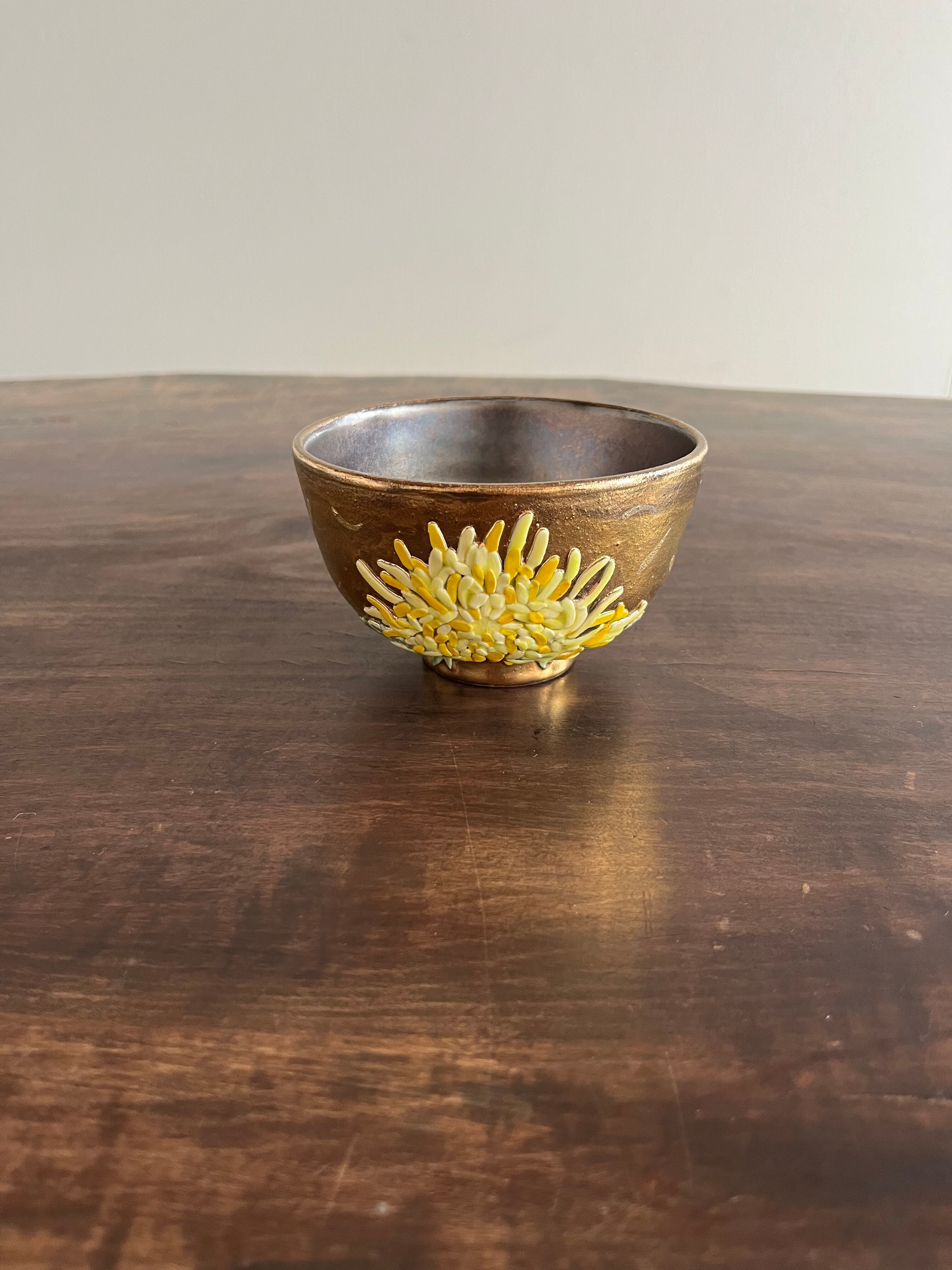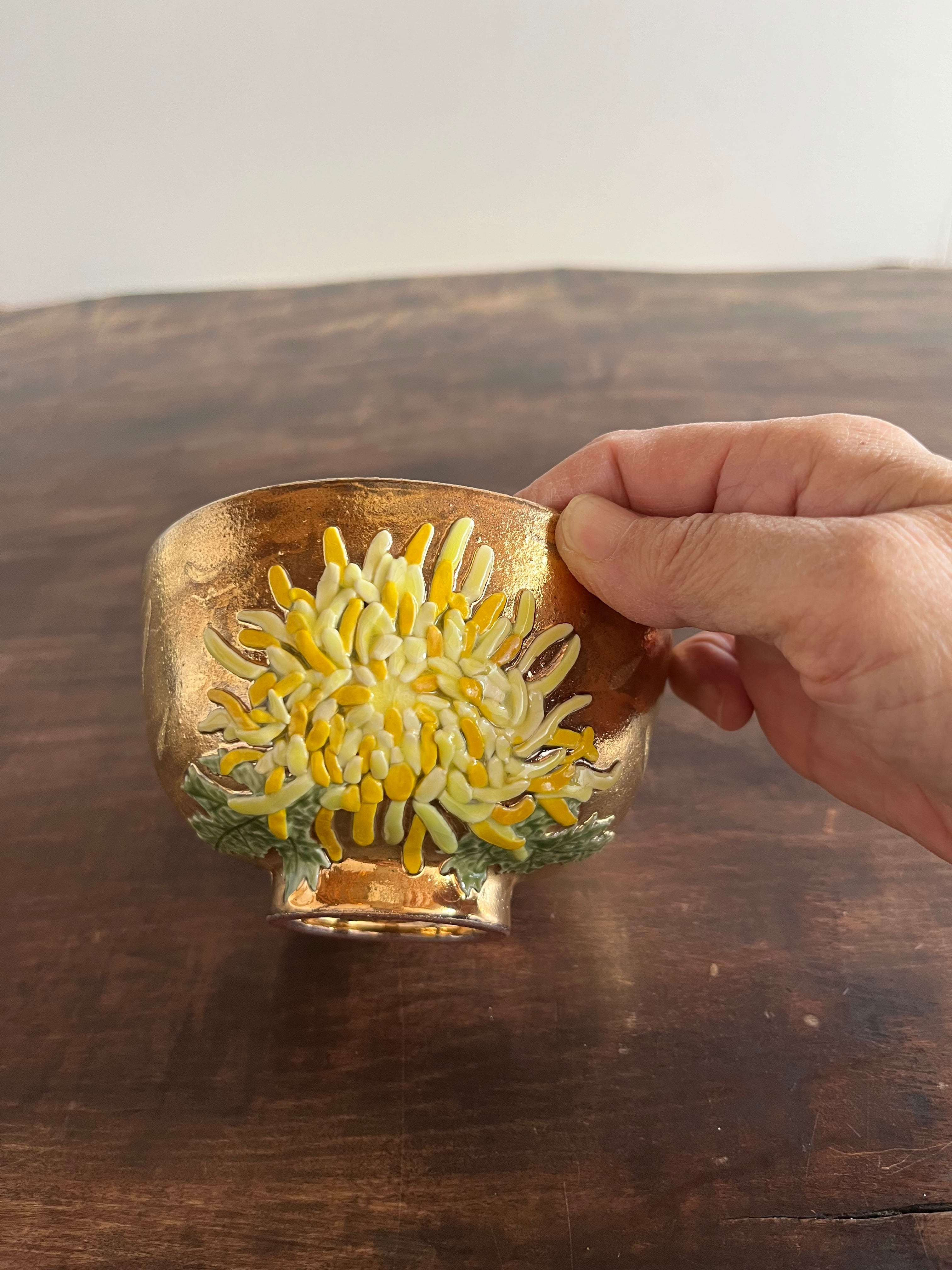 1995年大学卒業後、大阪の住宅メーカーで就職し働いたのち、地元姫路に戻り、趣味として始めた陶芸にハマり早18年。2013年から窯や電動ロクロなどを買い揃え、自宅リビングをアトリエに日々土と戯れています。この菊茶碗は、抹茶を楽しむための特別なアイテムで、金色の美しい仕上げが目を引きます。抹茶を点てる瞬間に、豪華な煌めきを感じることができるデザインに仕上がりました。お茶の時間がより特別なひとときとなることでしょう。
